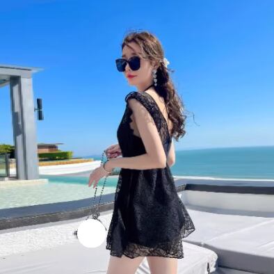 花柄レースと袖フリルのデザインが、夏のビーチやプールで主役級の存在感を放ちます。