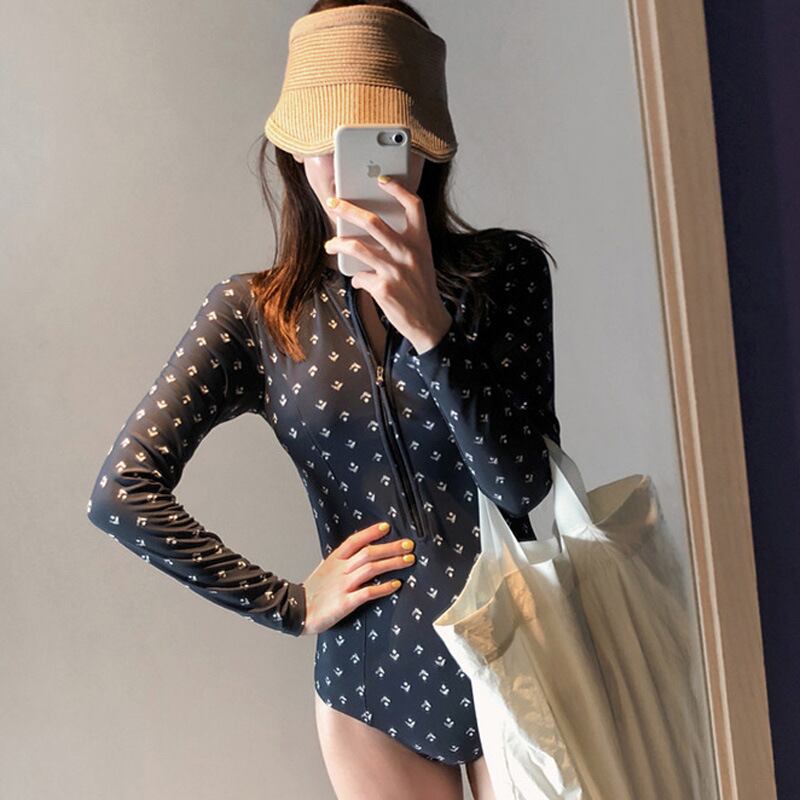 【送料無料】 水着 スイムウェア スイム ウエア レディース ラッシュガード 長袖 ワンピース水着 ハイウエスト ハーフジップ 総柄 ママ水着 大人 カジュアル 可愛い おしゃれ 人気 体型カバー 細見え 脚長 20代 30代 40代 プール 海 旅行 ブラック 黒 夏