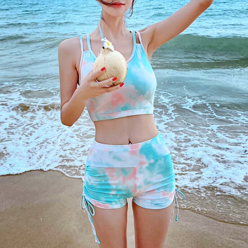 【送料無料】 水着 スイムウェア スイム ウエア 3点セット 水着セット レディース 上下セット セパレート タンキニ ラッシュガード 長袖 オーバーサイズ ルーズ ゆったり 薄手 タイダイ バッククロス ショートパンツ リボン ハイウエスト スポーティー カジュアル おしゃれ 人気 ママ水着 体型カバー お腹カバー 細見え 20代 30代 40代 プール 海 旅行 ライトブルー 大きいサイズ 夏