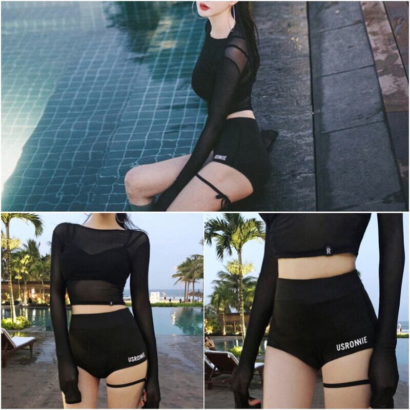 【送料無料】 水着 スイムウェア スイム ウエア 3点セット 水着セット レディース 上下セット セパレート タンキニ ラッシュガード 長袖 薄手 シアー シースルー 透け感 クロップド ショート丈 無地 ロゴ バッククロス ビキニボトム スポーティー カジュアル セクシー おしゃれ 人気 ママ水着 体型カバー お腹カバー 細見え 20代 30代 40代 プール 海 旅行 ブラック 黒 夏