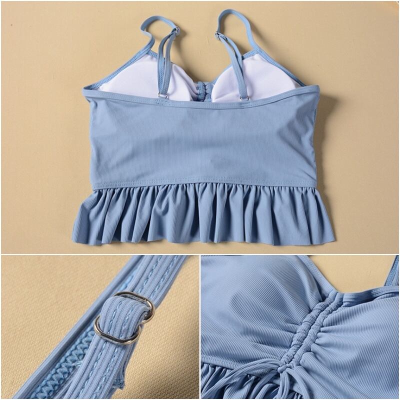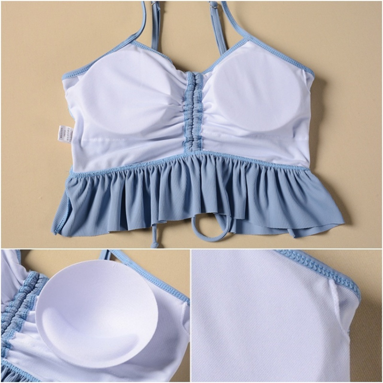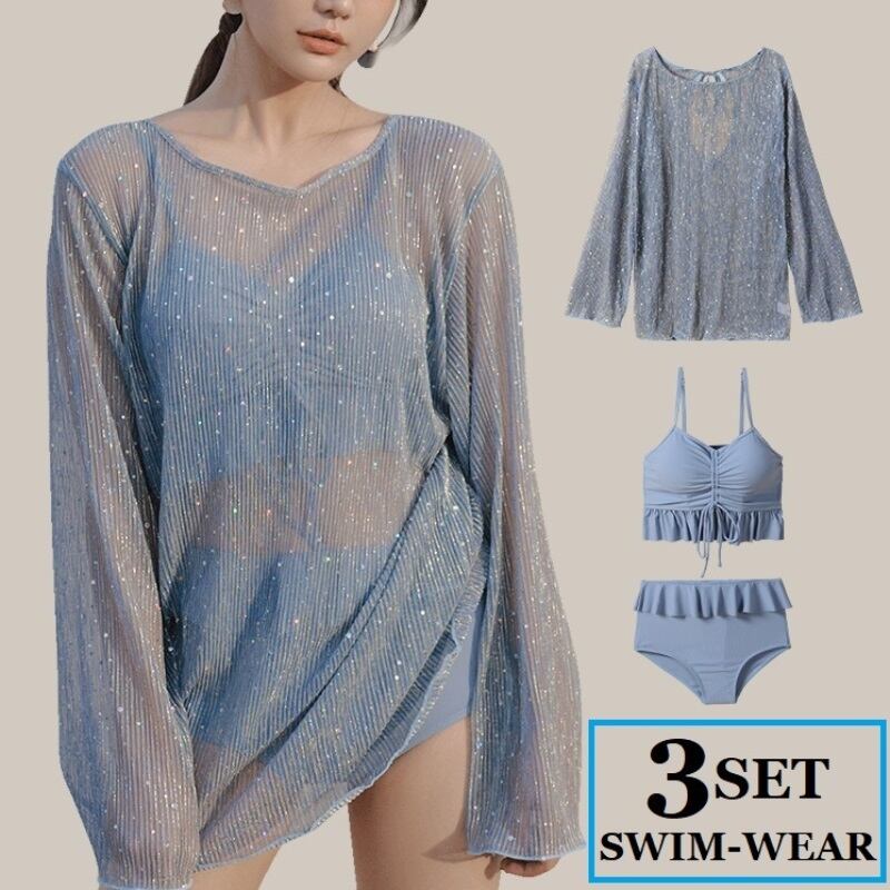 【送料無料】 水着 スイムウェア スイム ウエア 3点セット 水着セット レディース 上下セット セパレート タンキニ ラッシュガード 長袖 薄手 シアー 透け感 オーバーサイズ ラインストーン きらきら キラキラ 無地 フリル リボン りぼん ハイウエスト セクシー おしゃれ 可愛い ガーリー 人気 ママ水着 体型カバー お腹カバー 細見え 20代 30代 40代 プール 海 旅行 ブルー 夏