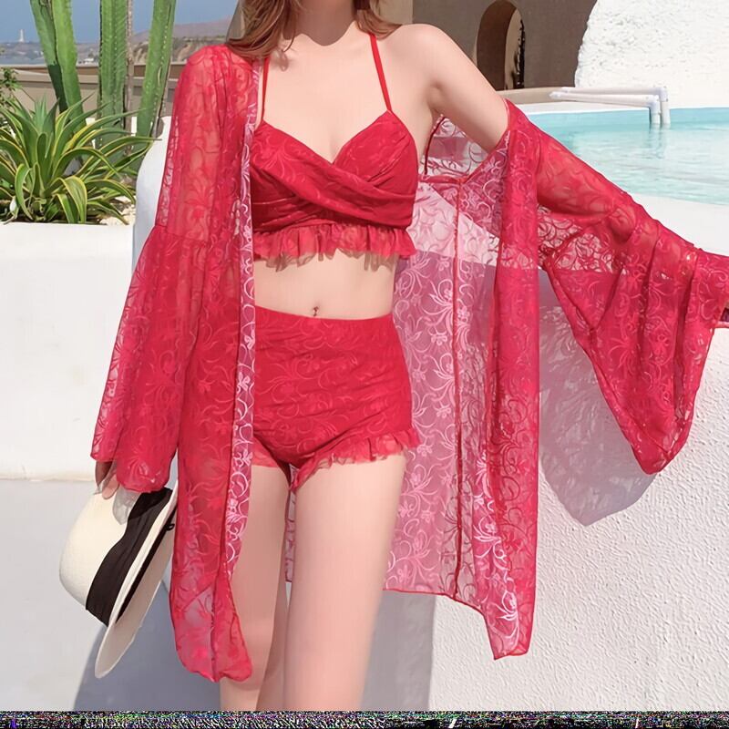 【送料無料】 水着 4色 スイムウェア スイム ウエア 3点セット 水着セット レディース レース 総レース ラッシュガード 長袖 カーディガン カーデ ロングカーディガン ガウン 薄手 透け感 タンキニ ビキニ セパレート ハイウエスト ショートパンツ セクシー 上品 きれいめ 大人 可愛い おしゃれ 人気 ママ水着 体型カバー お腹カバー 細見え 20代 30代 40代 プール 海 旅行 レッド ベージュ ホワイト ブラック 夏