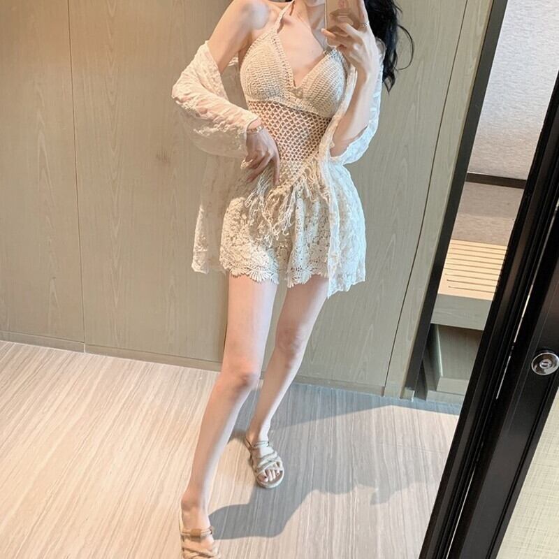 【送料無料】 水着 スイムウェア スイム ウエア 3点セット 水着セット レディース ラッシュガード 薄手 透け感 シアー レース柄 総レース 七分袖 カーディガン カーデ ガウン タンキニ セパレート ビキニ クロシェ クロシェニット スカート ハイウエスト セクシー 上品 きれいめ 大人 可愛い おしゃれ 人気 ママ水着 体型カバー お腹カバー 細見え 20代 30代 40代 プール 海 旅行 アイボリー 夏