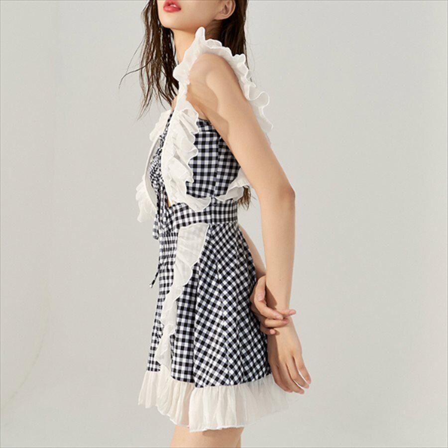 【送料無料】 モノキニビキニ 無地 チェック柄 フリル バイカラー 体系カバー 10代 20代 プール ビーチ リゾート ナイトプール ビーチパーティ 海 レディースファッション 可愛い Aライン フレア フェミニン ガーリー系 大人可愛い こなれ感