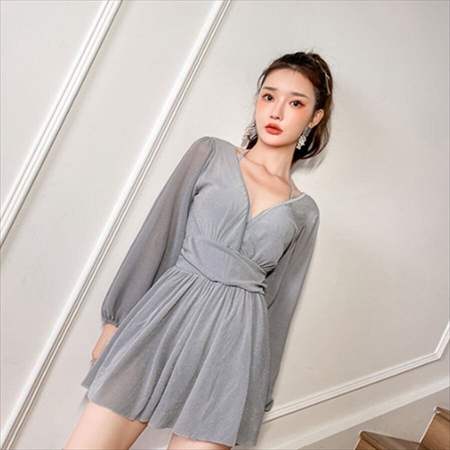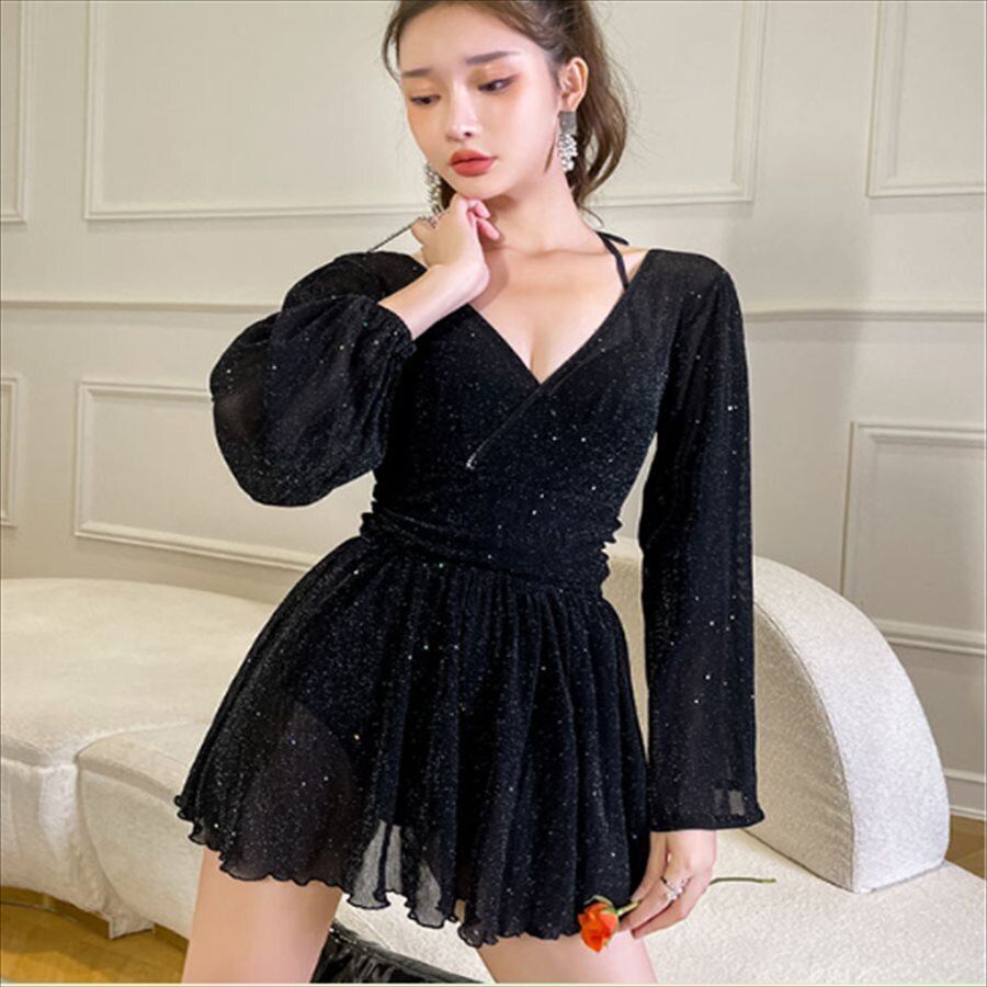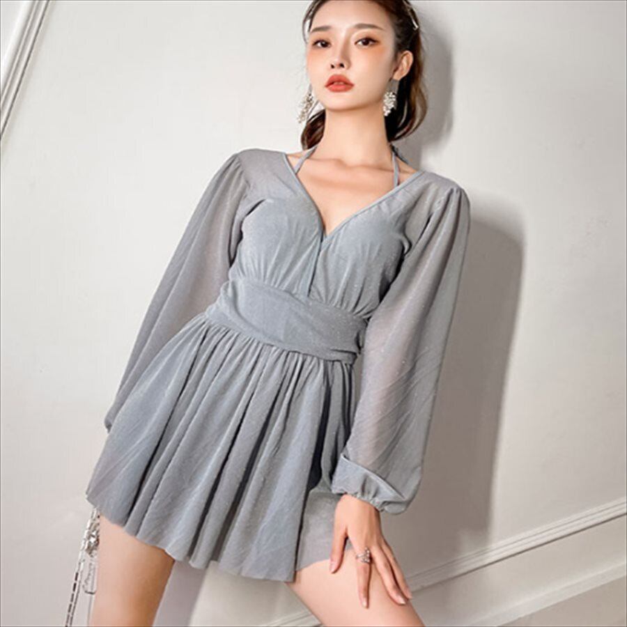 【送料無料】水着 2色 モノキニビキニ 長袖 ホルターネック 透け感 シースルー 日焼け防止効果 エレガント きれいめ 夏プール ビーチ リゾート ナイトプール ビーチパーティ 海 ママ水着 プチプライス 30代 40代 Aライン フレア