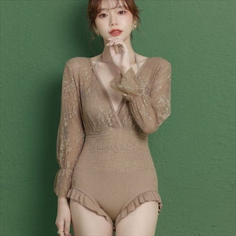 【送料無料】 水着 2色 長袖 レース 夏 エレガント系 きれいめ 大人可愛い 30代 40代 Vネック フレア袖 ラッパ袖 体系カバー フリル プール ビーチ リゾート ナイトプール ビーチパーティ 海 レディースファッション 可愛い