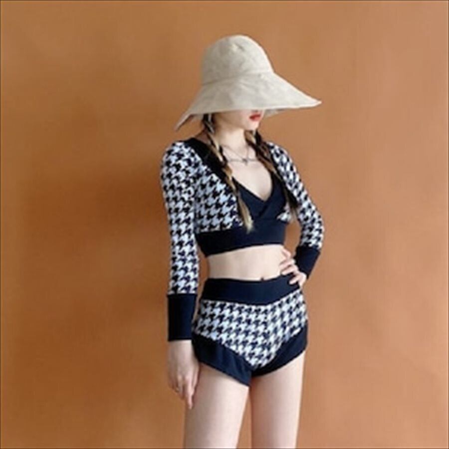 【送料無料】 水着 千鳥格子 タンキニビキニ 長袖 ショートパンツ エレガント系 きれいめ 大人可愛い 体系カバー こなれ感 フェミニン Vネック ハイウェスト 夏 30代 40代 プール ビーチ リゾート ナイトプール ビーチパーティ バイカラー レディースファッション 可愛い