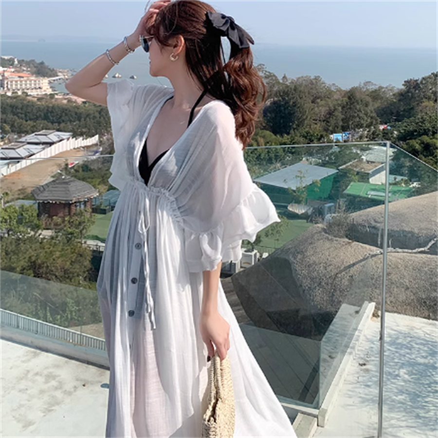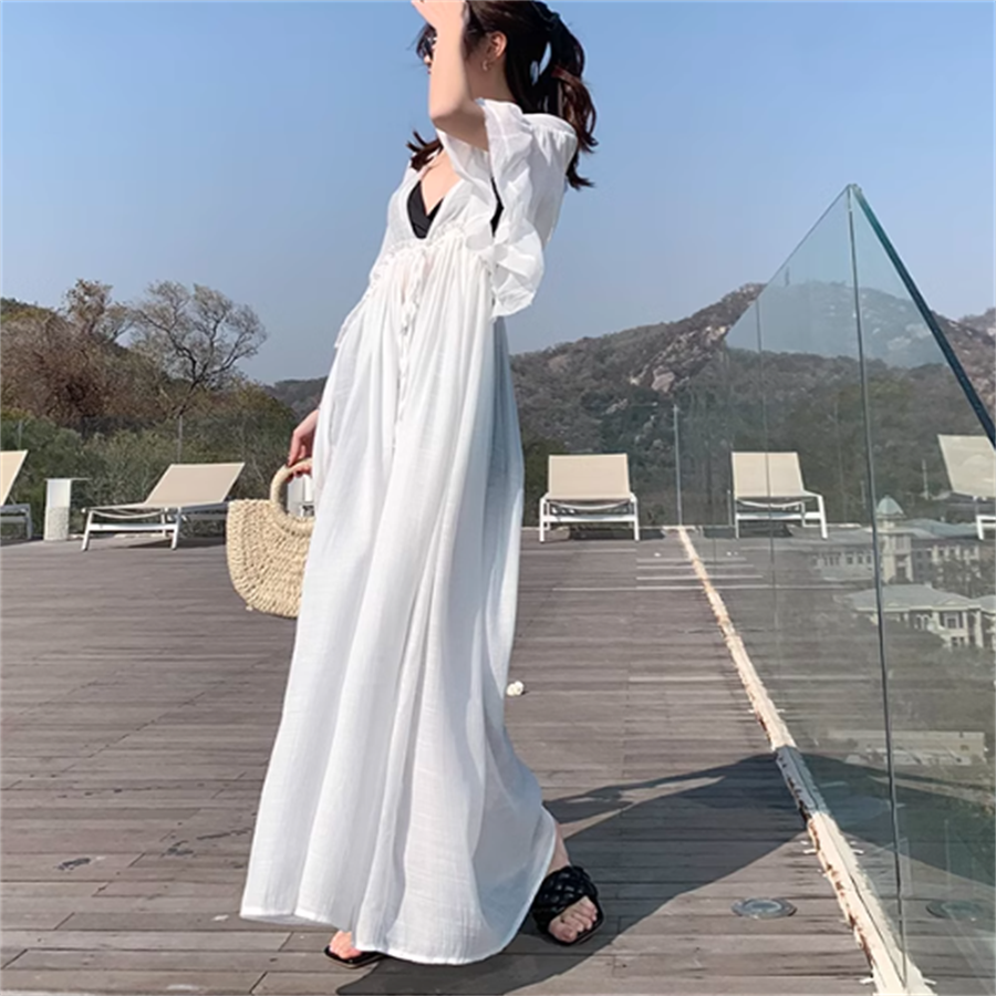 【送料無料】ラッシュガード アウター 羽織り ロングカーディガン 日焼け防止 UV サマーカーディガン ガウン 冷房対策 ロング マキシ丈 半袖 フレア袖 フレアスリーブ Vネック フレア Aライン 透け感 シースルー 薄手生地 かわいい 大人可愛い 綺麗 シンプル カジュアル 大人 上品 おしゃれ お洒落 大人女子 こなれ感 エレガント コンサバ 定番アイテム 体型カバー 無地 夏 女性 レディース ママ 20代 30代 40代 お呼ばれ お茶会 授業参観 休日 アウトドア プール 海 ビーチ リゾート
